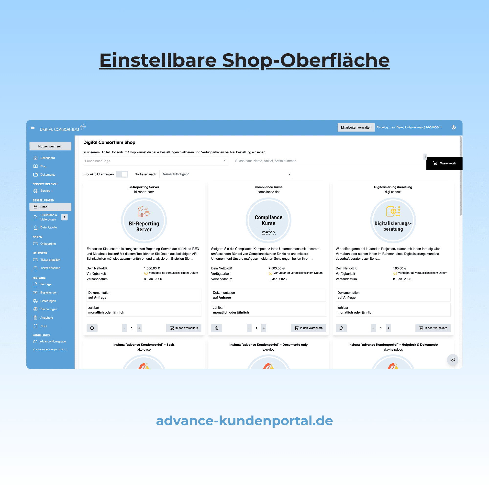 - B2B-Produktkatalog & Warenkorbfunktion: Ermöglichen Sie eine smarte und geführte Bestellabwicklung direkt aus Ihrem Portal – mit Bildern, Kategorien & Produktdetails - auch für Ihre Variantenartikel.